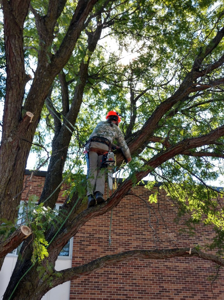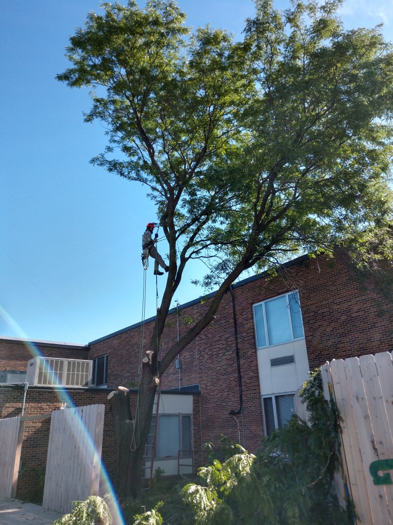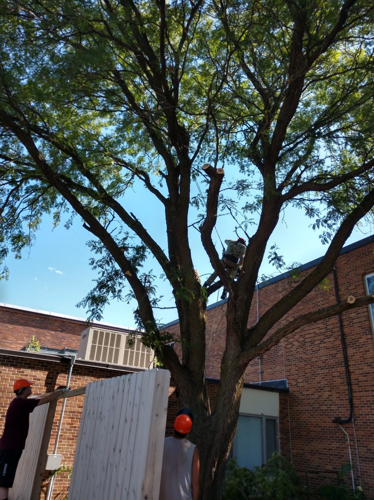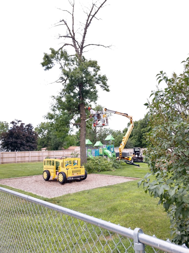 This project in 2018 was one of our more interesting jobs. The 60′ locust tree located in the greenspace at the center of the Okoboji Elementary School required the skill of a tree climber. Each piece then had to be carefully carried into the hallway then out the front doors. We also removed a diseased tree from the playground area. It was a memorable project for our children and grandchildren who are students at Okoboji.