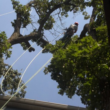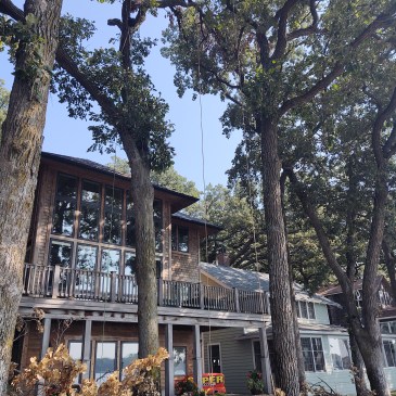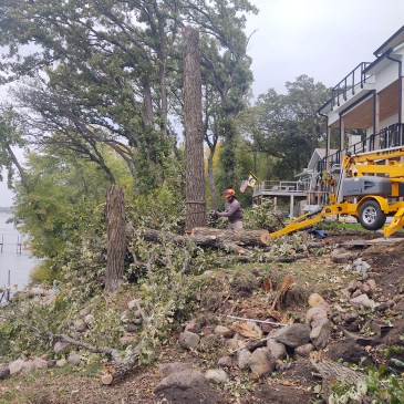 Climbing storm damage out of the top of Oak trees where it had gotten tangled. Often lakeside equipment access is not an option, the skill of a tree climber is required. We’ve all heard of “Where’s Waldo” but I challenge you to find “Where’s Jason?” in these pics.
